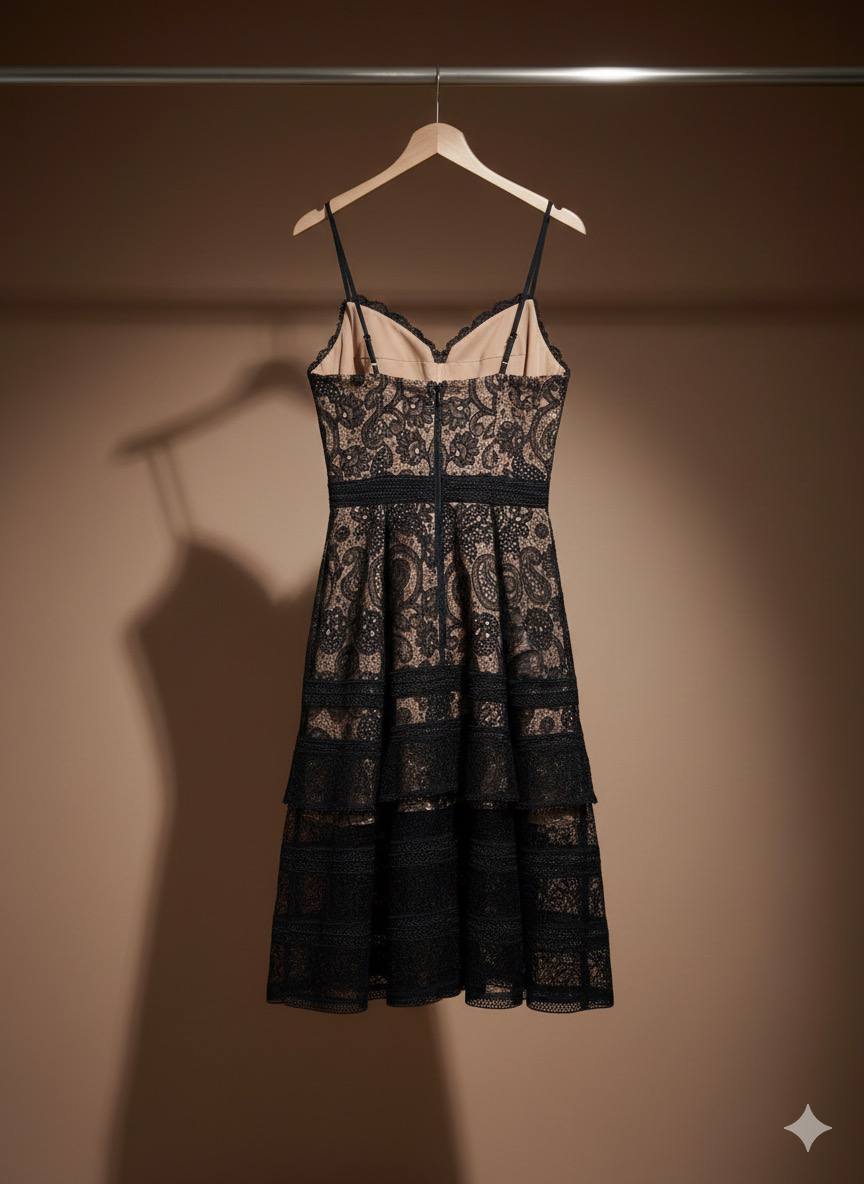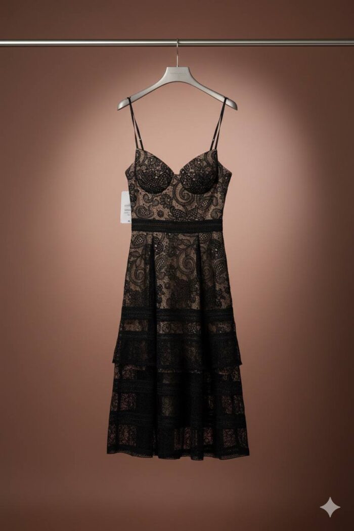 این لباس مشکی با طراحی لایهلایه و پارچه دانتل ظریف، تجلی خیرهکنندهای از ظرافت و جسارت است. نیمتنه فنردار، بندهای باریک و برش دقیق کمر، جلوهای زنانه و فرمدهنده به اندام میبخشند.
